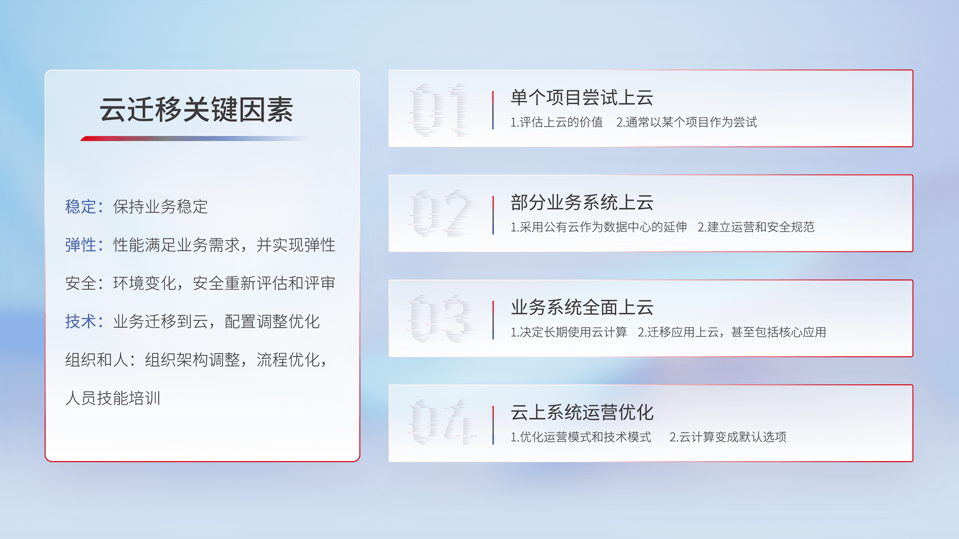 结合实际业务,,,,从规划设计、、、云平台选型、、、云原生改造、、、数据迁移、、、集成交付,,迁移全过程为客户识别最佳上云路径,,,,做好风险识别管理,,,,设计网络架构、、、身份权限、、、、安全审计合规、、、、操作审计、、、日志审计、、监控告警策略、、多站点容灾设计等,,对云上基础设施进行整体规划,,,,提升IT治理水平,,,以满足弹性、、高可用、、高性能的需求。。